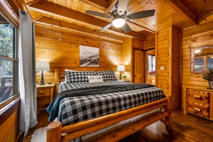 • Twin-over-queen log bunk bed in open loft. This area is counted as a bedroom, but it is open to the main level.